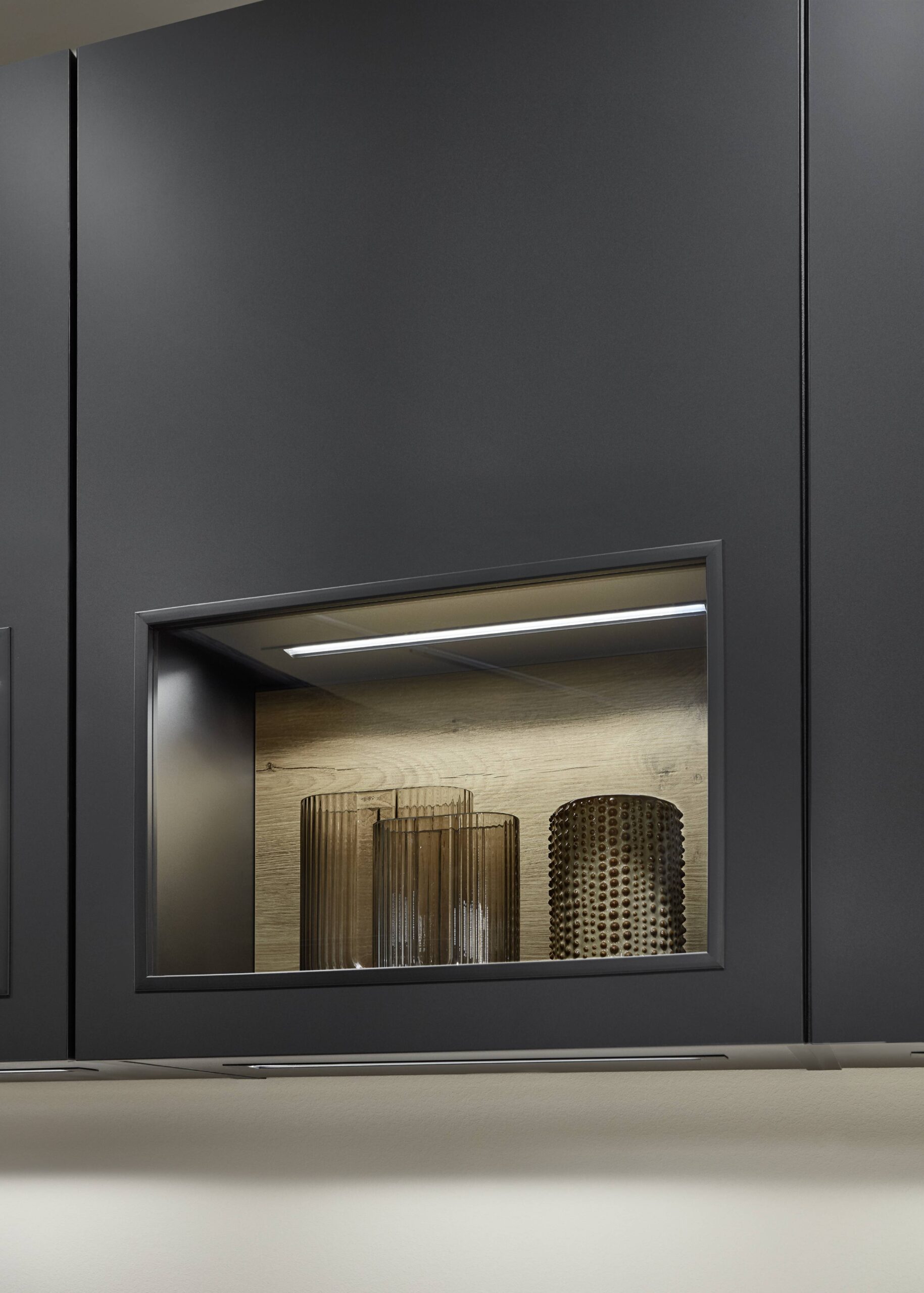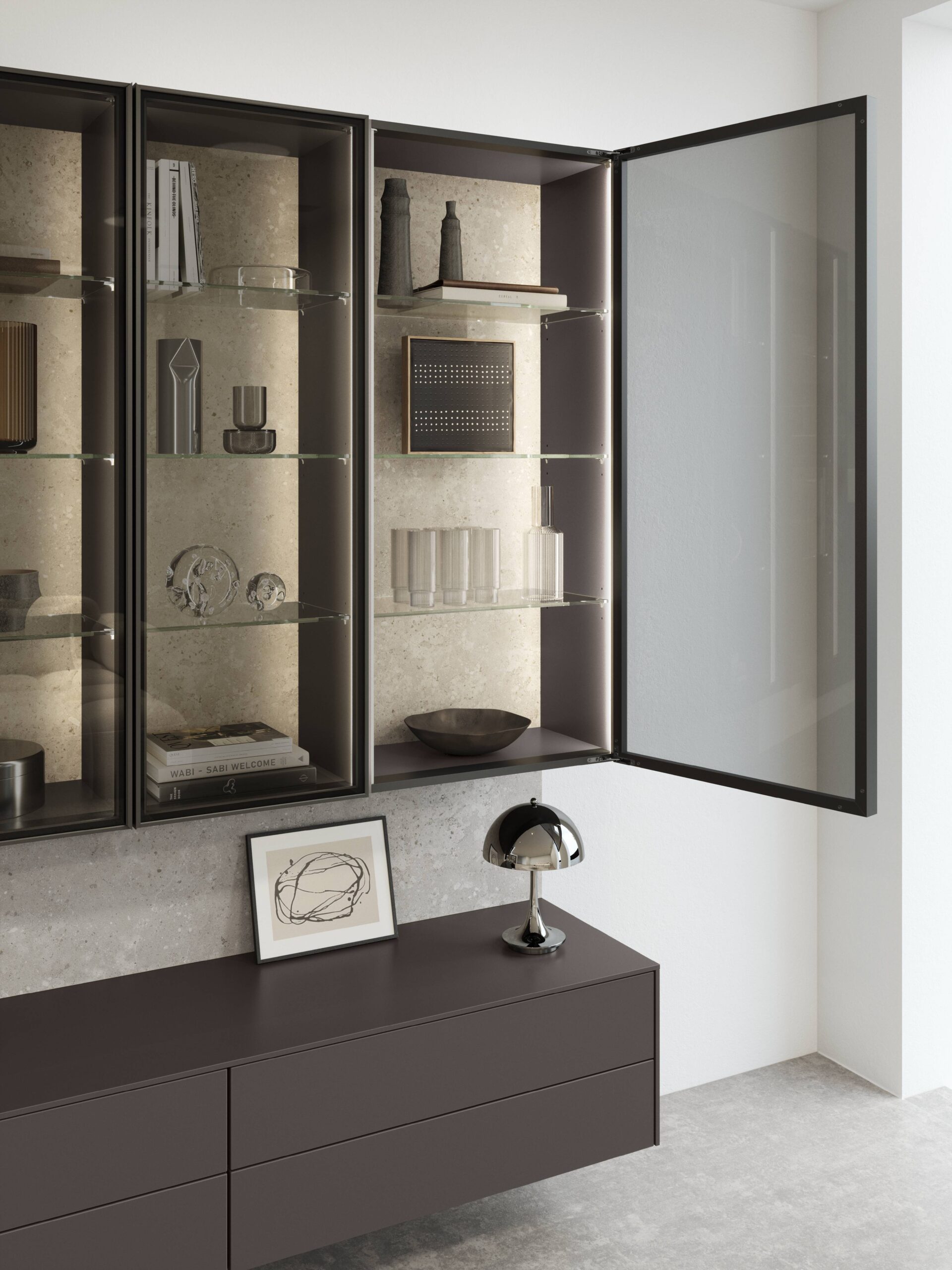 La vitrina Air es un punto culminante para cualquiera que aprecie el diseño purista y la calidad. El marco de filigrana de aluminio en negro con un tirador integrado crea un aspecto moderno y elegante. Las bisagras totalmente ocultas acentúan el aspecto minimalista y confieren a las vitrinas un aspecto casi flotante. Ya sea en la cocina, en el salón o en el cuarto de baño, la vitrina Air, destaca con estilo en cualquier habitación.