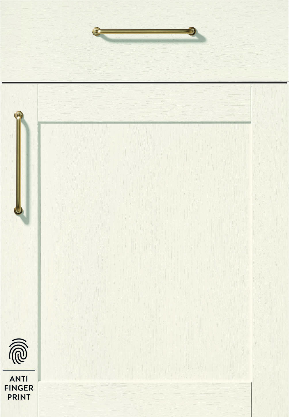 Elegancia atemporal. El nuevo frente de marco de cinco piezas en blanco combina formas clásicas con una fina textura de madera.